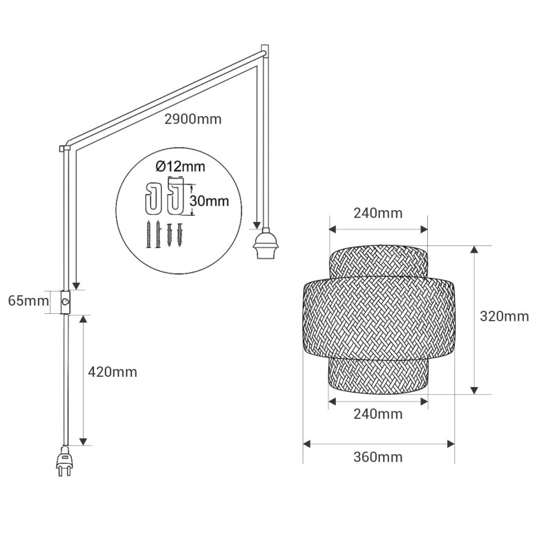 - Flexible installation: Includes adjustable cable with two decentralizing hooks for different configurations. Incorporates switch and Schuko socket, ideal for spaces without a light point nearby. Available in black, white and natural rope.