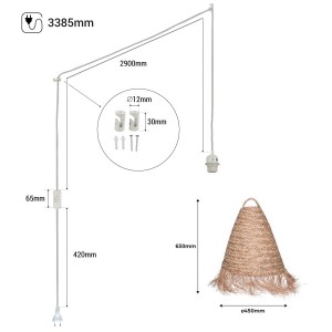 It includes an adjustable cable with two decentraliser hooks, allowing for various installation configurations. Along its length the cable features a switch, and at its end, a standard Schuko plug. This system facilitates the installation of the lamp in locations where there's no nearby outlet available.
