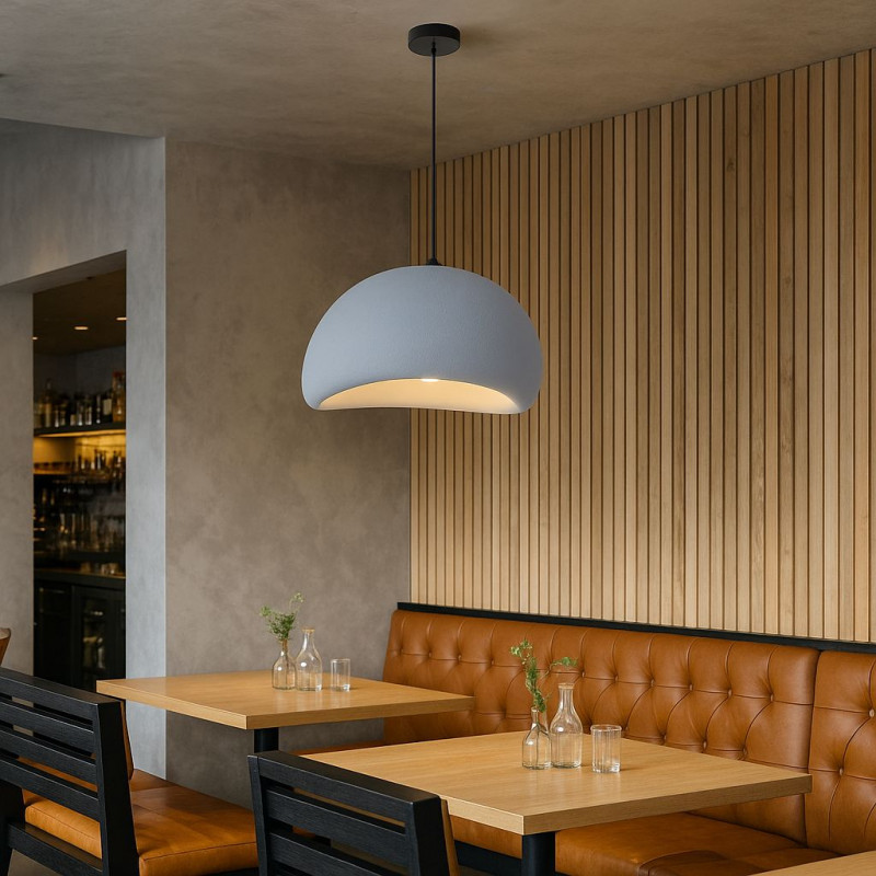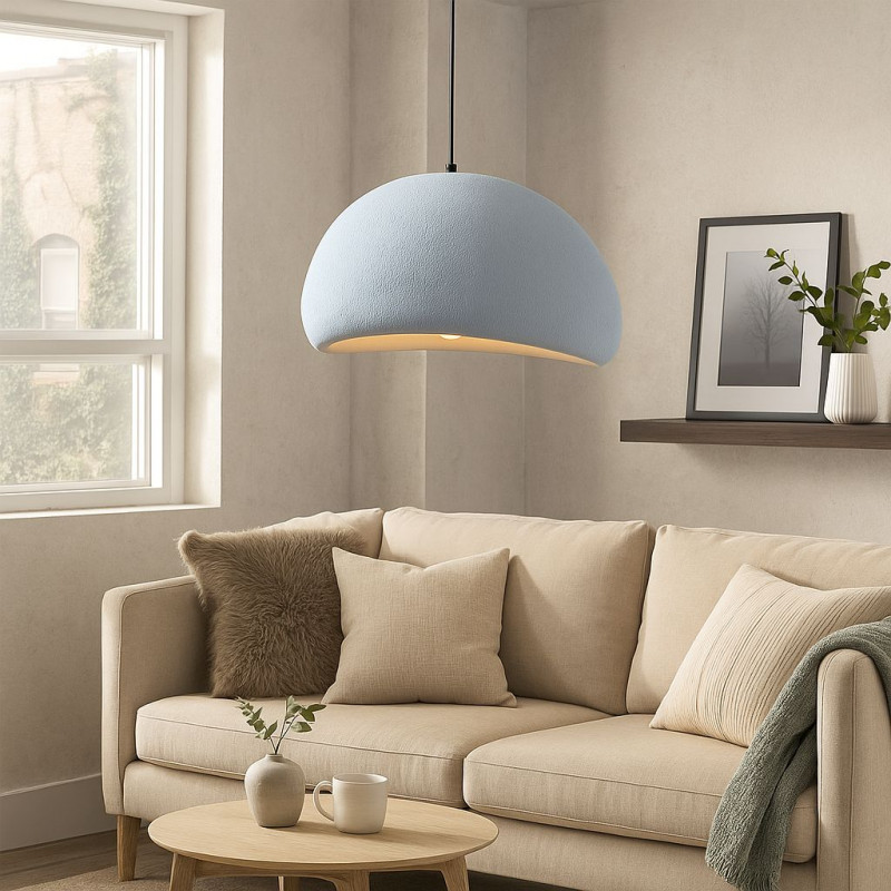 Pendant lamp made of resin with textured finish. Its handcrafted design and neutral tones bring calm and visual harmony to any environment.