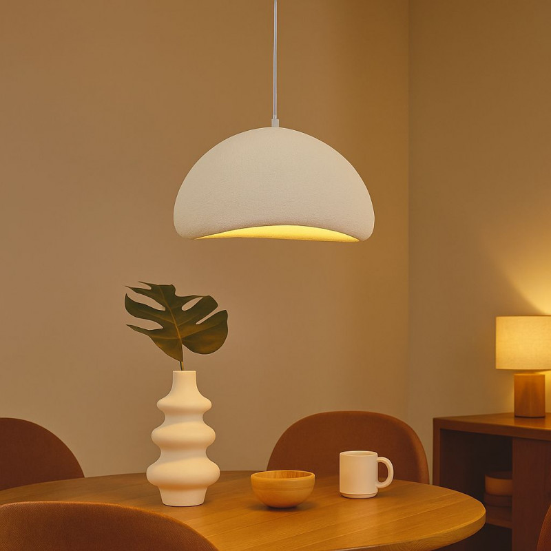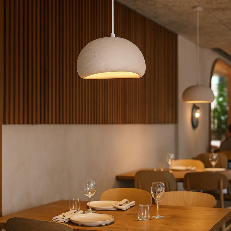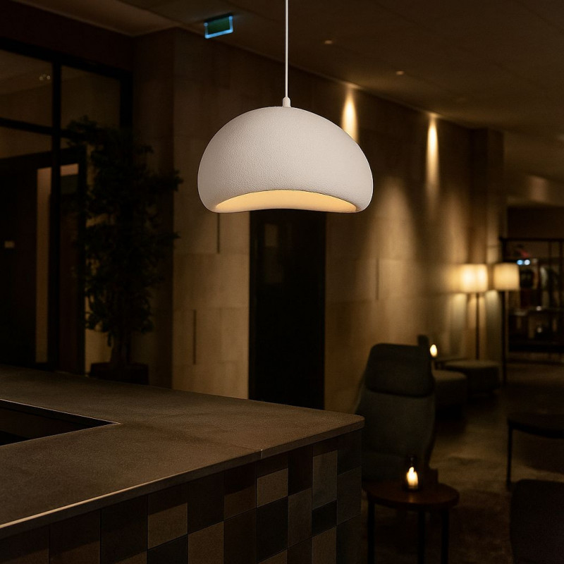 Pendant lamp made of resin with textured finish. Its handcrafted design and neutral tones bring calm and visual harmony to any environment.