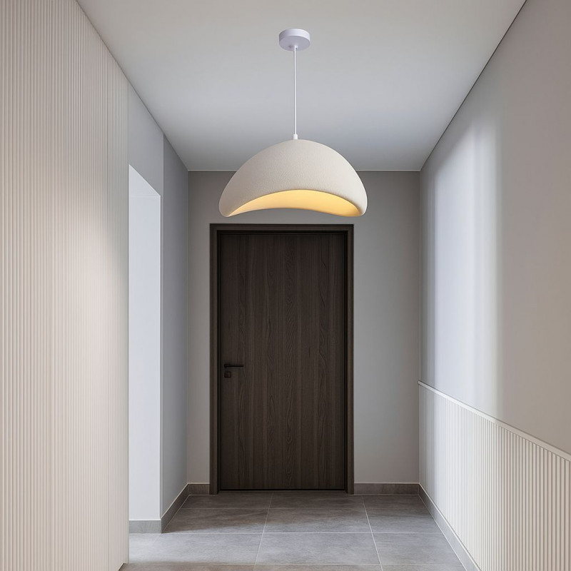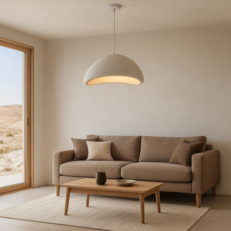 Suspended lamp made of resin with textured finish. Its handcrafted design and neutral tones bring calm and visual harmony to any environment.