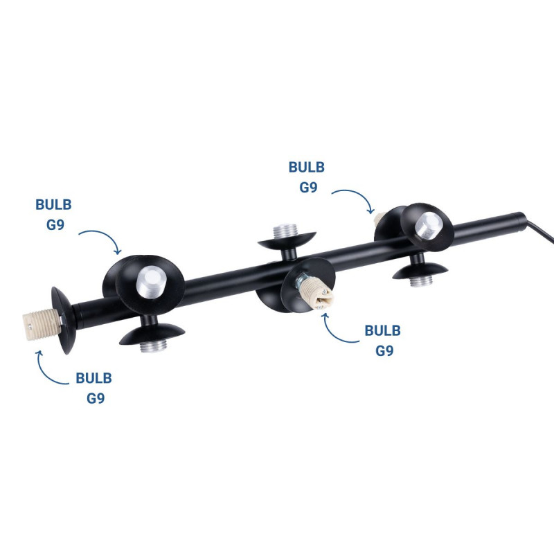 Inspired by the essence of the abstract, this piece features a vertical design, composed of 10 spheres of Ø140mm each: 4 luminous spheres (G9 bulbs) in opal glass and 6 sound absorbers covered by an acousrtic fabric, available in gray or brown.