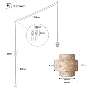 It includes an adjustable cable by means of two decentralizing hooks, which allow different installation configurations. In its route, the cable incorporates a switch, and at its end, a standard Schuko plug. This system facilitates the installation of the lamp in places where there is no nearby light point available.