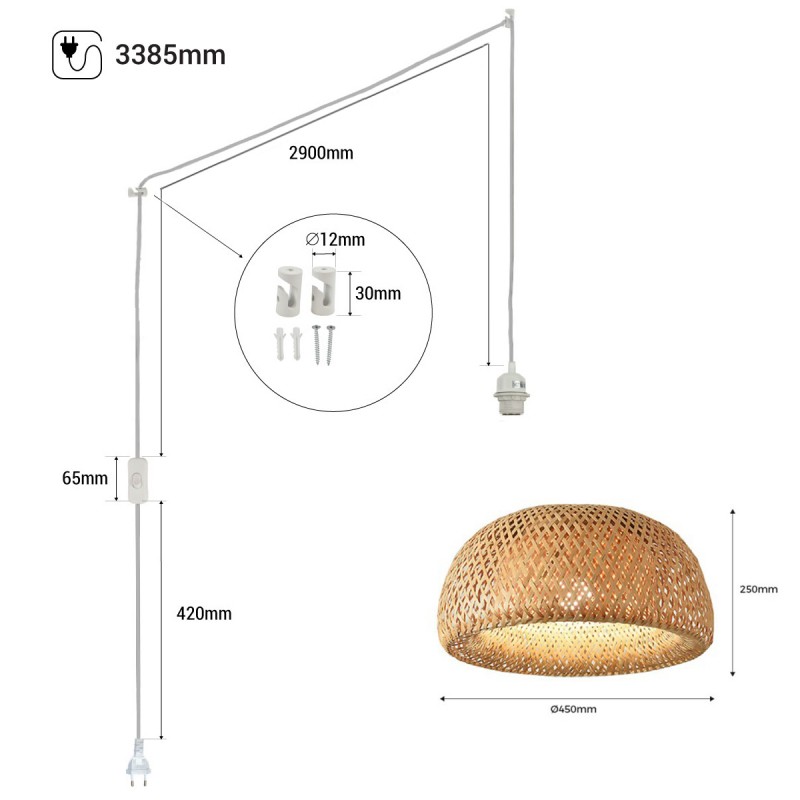 It includes an adjustable cable by means of two decentralizing hooks, which allow different installation configurations. The cable incorporates a switch and a standard Schuko plug at the end of the cable. This system facilitates the installation of the lamp in places where there is no nearby light point available.