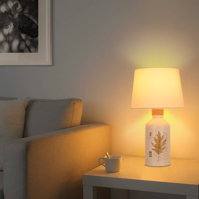 Elegantceramic table lamp. The white fabric shade allows you to illuminate dimly or create a warm and enveloping atmosphere in a bedroom, desk or on top of any surface, with originality. Shiny ceramic with non-slip bottom.