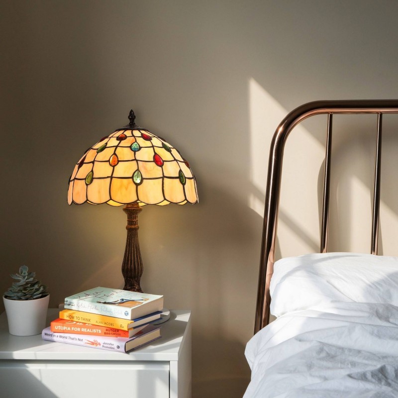 Its elegant decorative shade is inspired by the iconic Tiffany lamps. It is made entirely of glass in a beige shade with multicolored accents.