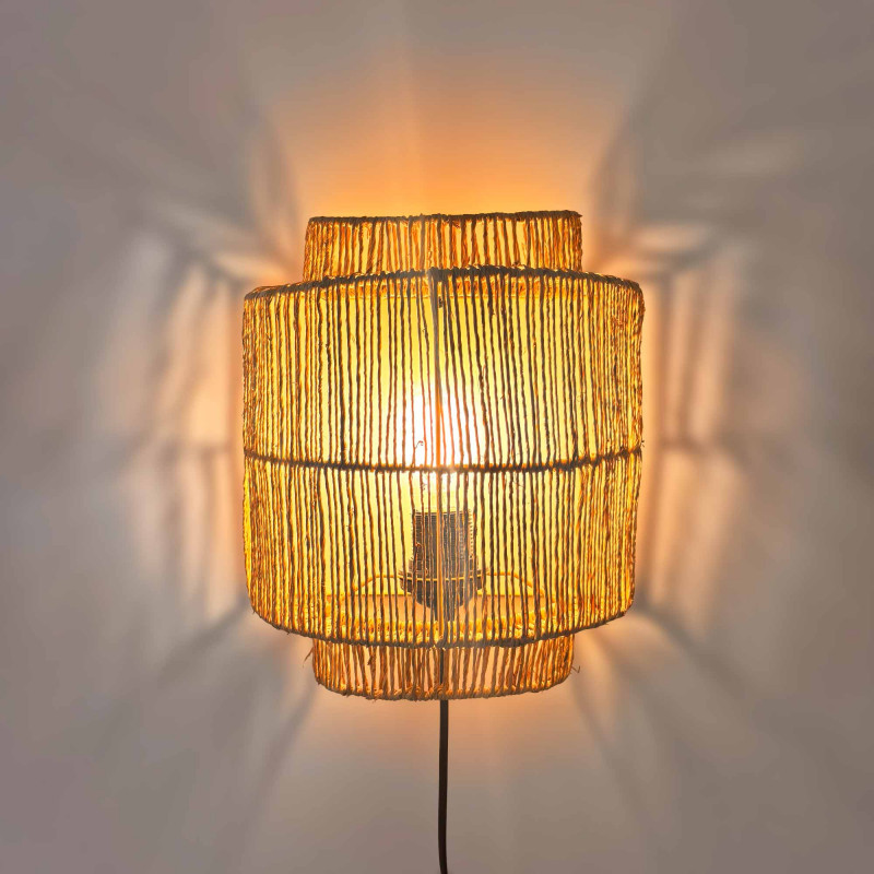 This wall lamp stands out for its fluid and organic design, handcrafted with vegetable fibers that enhance the warmth and personality of the space. Perfect for living rooms, bedrooms, hallways or reading corners.
