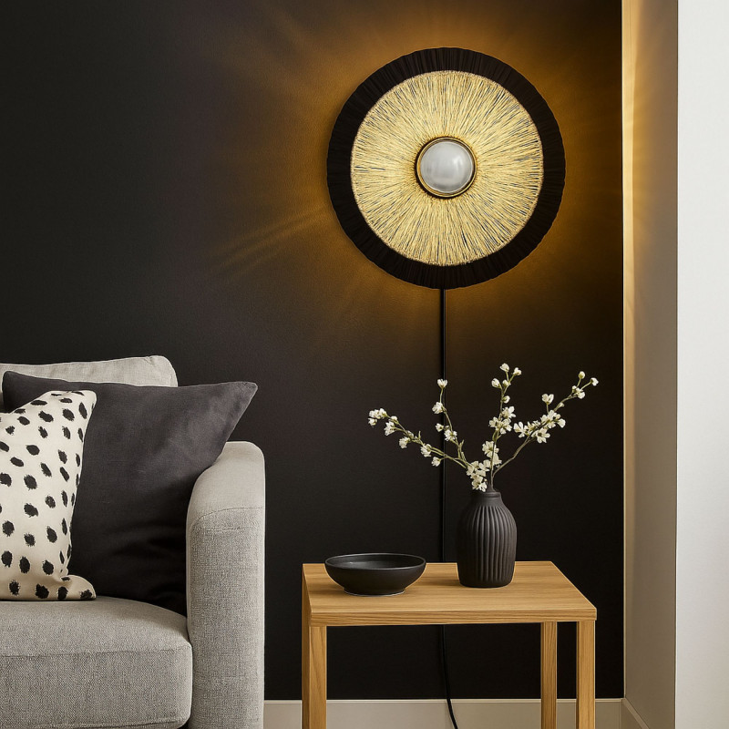 This wall lamp stands out for its fluid and organic design, handcrafted with vegetable fibers that enhance the warmth and personality of the space. Perfect for living rooms, bedrooms, hallways or reading corners.