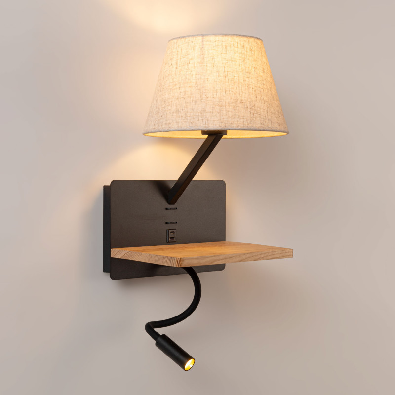 The wall light incorporates a USB port and a USB-C port, with a wooden base to support the cell phone, allowing a practical charging during the night.
