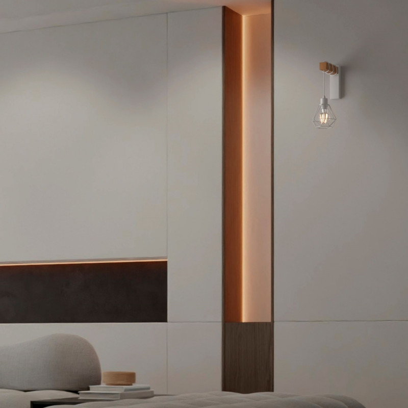 The interior wall lamp integrates an E27 socket, the bulb is not included with the lamp. Not including the E27 LED bulb, gives us the possibility to choose the bulb that best suits the needs of the place where we are going to install the wall lamp. For this type of lamps we recommend installing the Edison filament LED bulb with E27 socket to enhance the vintage look of the wall lamp.