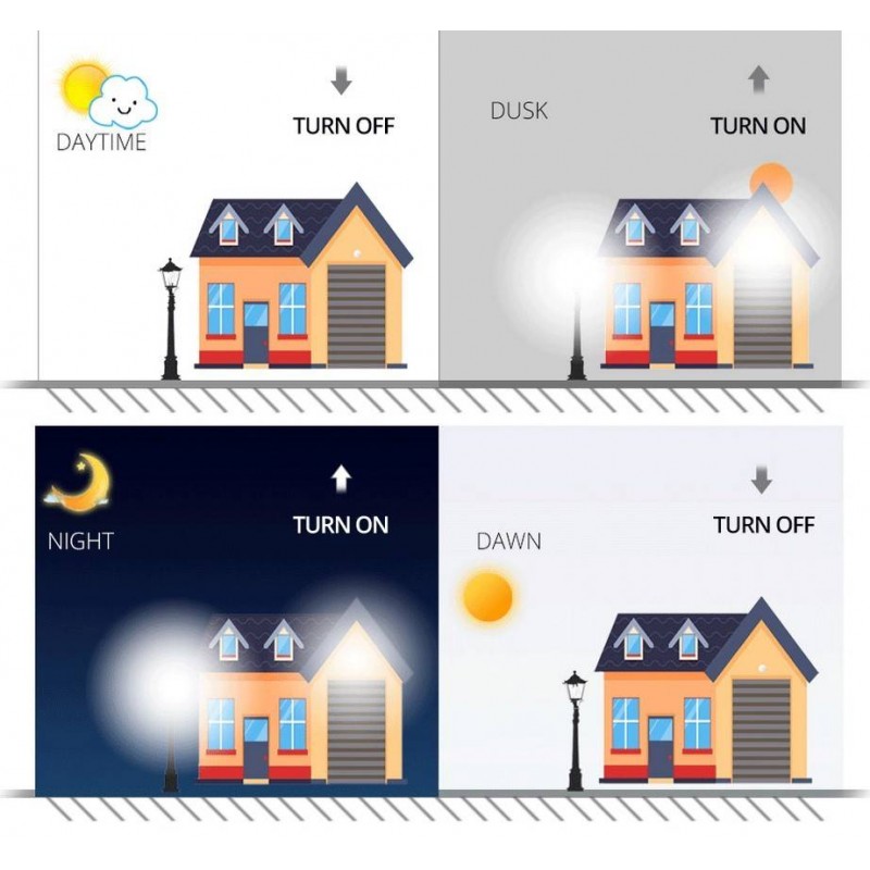 - Auto on/off: Activates at dusk and turns off at dawn without intervention.