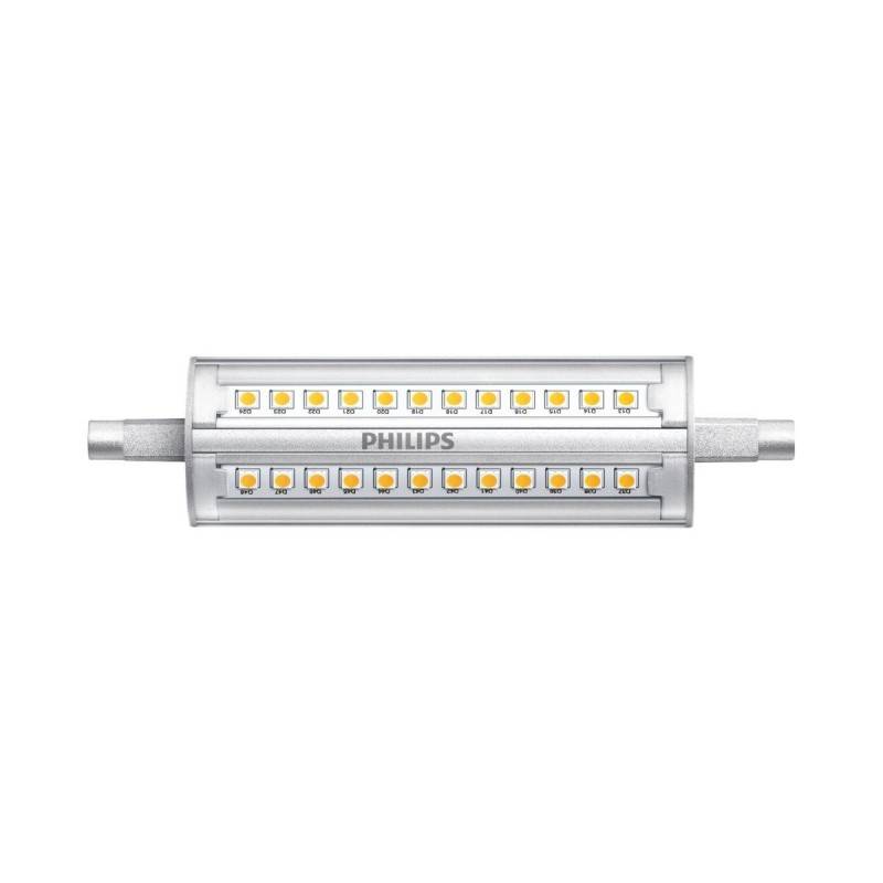 DimmableR7S LED bulb replaces linear double-ended halogen lamp. Low power consumption of LED lamps. Perfect adaptation in decorative luminaires in stores and hostelry. Power of 14W and a high luminous intensity of 1600 lumens. You can choose between the color temperature of 3000ºK, 1600lm, with reference 57879700 and neutral white of 4000ºK, 1800lm, with reference 57881000. Equivalent to a power of 100W. Dimmable R7S LED bulb from CorePro LEDlineal R7S Philips, the best quality products at an affordable price. Luminous efficacy of 114.29lm/W. Ideal for installation in living rooms, hallways, outdoor luminaires, floor lamps, construction lighting, etc.