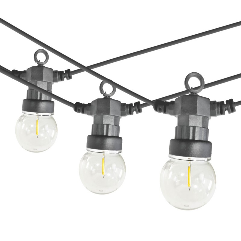 LED Garland with a warm white color temperature of 3000 degree Kelvin, ideal for creating a pleasant and comfortable atmosphere. The LED Garland has a compact and integrated shape with 20 LED bulbs with a power of 9W, a luminous intensity of 450 lumens, with a beam opening angle of 360 degrees. IP44 degree of protection that makes it resistant to moisture (not suitable for exposure to water or rain). Wiring and black cap. Each transformer can support two garlands in series.