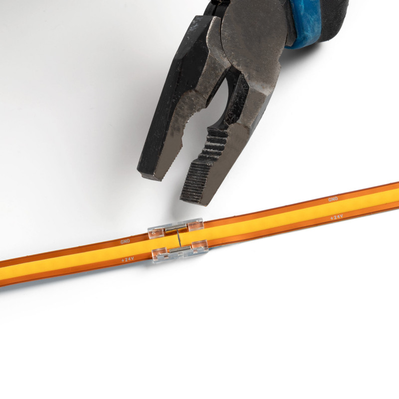 Connector clip between 2 pinsingle color LED strips, small size, invisible. Perfect solution for COB LED strips, strips with high density and unique linear illumination. The quick connector gets rid of the dark zone caused by the conventional connector between two high density LED strips and provides a complete and quality finish for both the individual and the lighting professional.