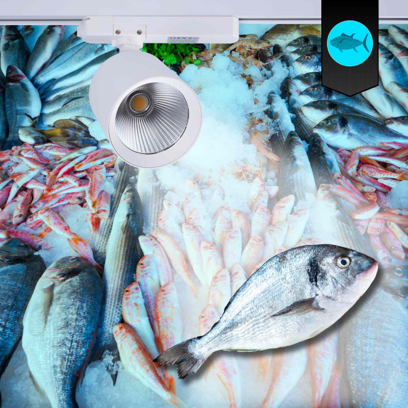 This single-phase LED track spotlight combines efficiency and aesthetics, with a specialized LED chip to enhance the appearance of fish and seafood, guaranteeing a fresh and eye-catching presentation to customers.