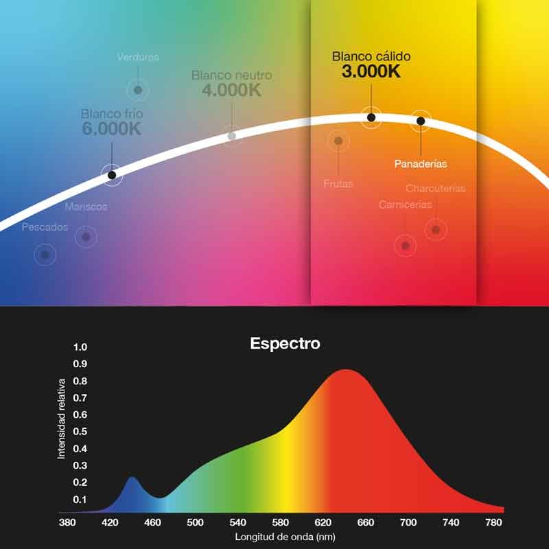 The special LED spotlight for bakeries incorporates a R00VA19 chip with the purpose ofHIGHLIGHTING THE COLORS OF THE PRODUCTS OF YOUR SHOWCASE, SHOWING THEM MUCH MORE ATTRACTIVE to your final consumers. It illuminates with the highest efficiency and enhances to the maximum the characteristics of your products thanks to its high quality LED light.