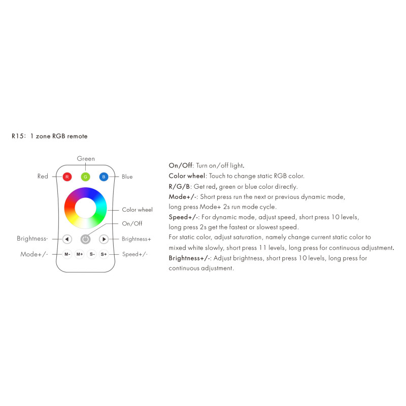 - Independent buttons: Includes buttons for on/off, color dimming (R/G/B), brightness and speed adjustments in dynamic mode.