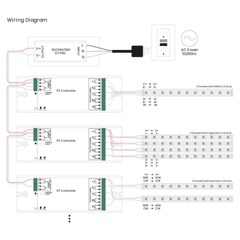 The RGB / RGBW Dimmer Controller offers full compatibility with a wide variety of single-color, two-color or RGB/RGBW RF remote controls.