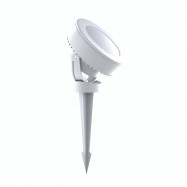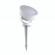 LED stake with spike and circular design, made of resin resistant to shock, corrosion and UV rays. It is installed by driving it into the ground, grass or sand.