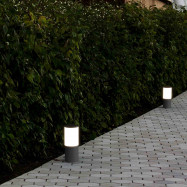 Small size (25cm) pathway lighting bollard, with a modern design with tubular shape and made of shockproof resin, resistant to oxidation, corrosion and UV rays.