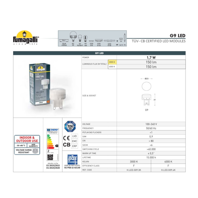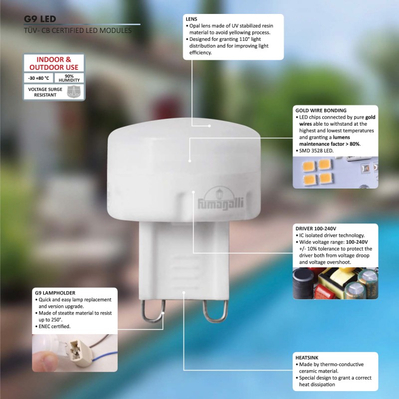 The G9 socket allows easy bulb replacement. The LED bollard is supplied with long life and high performance G9 LED bulb. Power of 1.7W with a high efficiency of 100lm/W. A total luminous intensity of 170 lumens. Voltage of 100-240V. Beam opening angle of 110 degrees. 3000ºK warm light.