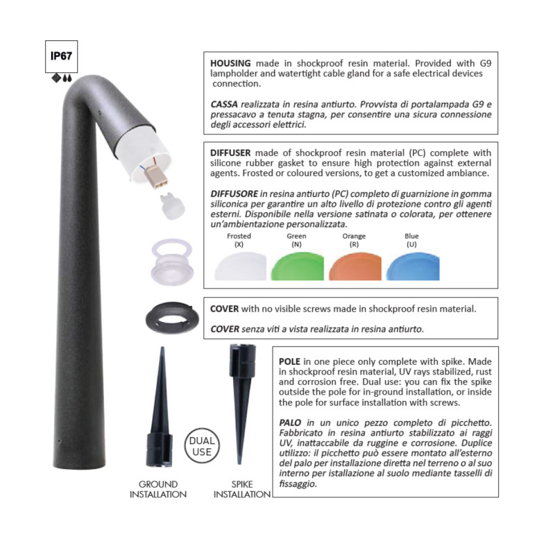 It allows two installation modes: you can install the LED bollard on the ground either with spike or only with plugs.