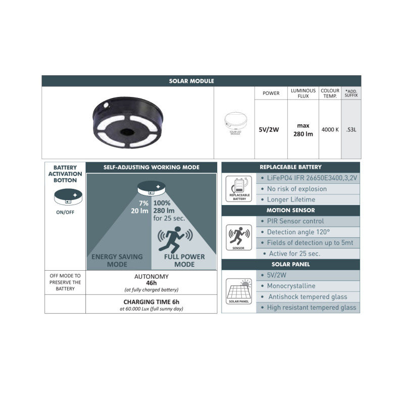 - Full power mode: When motion is detected, the light is activated at 100% (280 lm) for 25 seconds, improving visibility and safety.