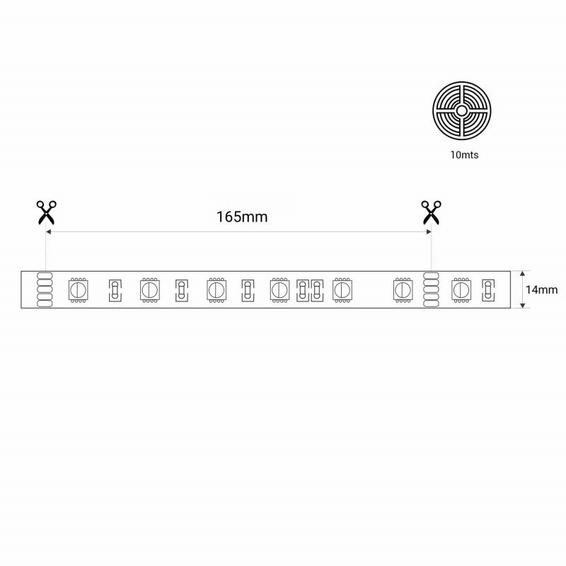 - Dimensions and cut: RGB: width 14mm, length 10m and cut every 165mm. Single color: width 12mm, length 10m and cut every 100mm. It should be taken into account that when cutting the strip it can lose its watertightness.