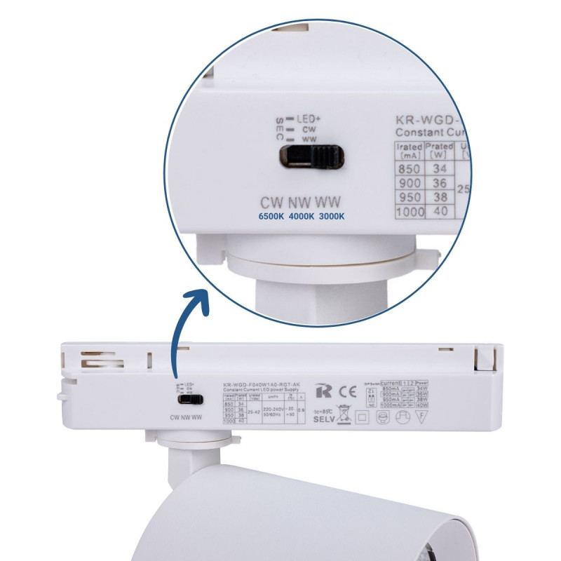 Όσον αφορά τη θερμοκρασία φωτός, το σύστημα CCT επιτρέπει τη ρύθμιση της θερμοκρασίας χρώματος σε τρεις τόνους: θερμό φως (3000K), ουδέτερο φως (4000K) ή ψυχρό φως (6500K), μέσω ενός διακόπτη dip-switch που ενσωματώνεται στον οδηγό- προσαρμόζεται έτσι στις ειδικές ανάγκες του έργου.