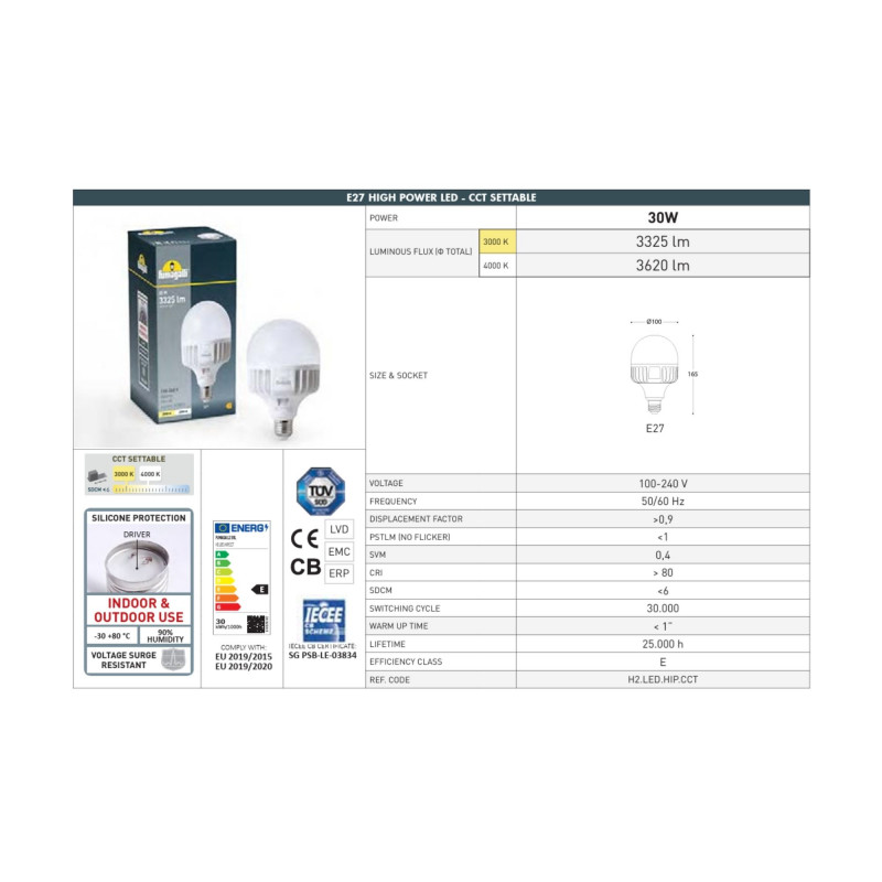 - Σύστημα Dimmable CCT: Επιτρέπει την επιλογή μεταξύ ζεστού λευκού (3000K) και ουδέτερου λευκού (4000K) μέσω ενός διακόπτη που είναι ενσωματωμένος στο λαμπτήρα.