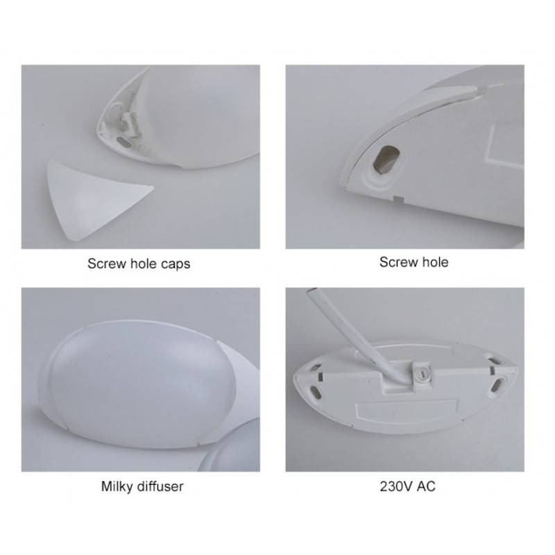 Κατασκευάζεται από λευκό πλαστικό ABS με οπαλικό κάλυμμα. Περιλαμβάνει καλώδιο 20 cm για απευθείας σύνδεση σε 230V.
