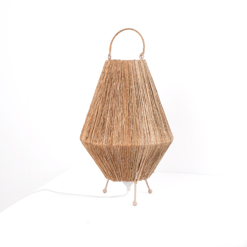 Φωτιστικό δαπέδου χειροποίητο από γιούτα. Η πλέξη του επιτρέπει τη διάχυση του φωτός με έναν διακριτικό και ζεστό τρόπο, ενώ παράλληλα αναδεικνύει τις υφές του υλικού.