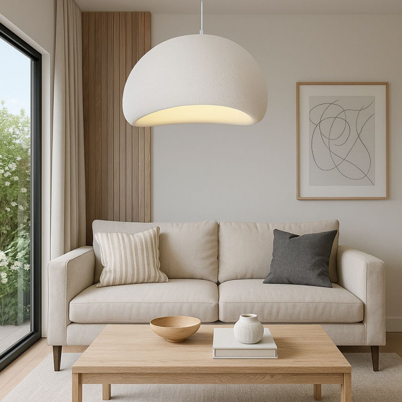Κρεμαστό φωτιστικό από ρητίνη με φινίρισμα υφής. Ο χειροποίητος σχεδιασμός του και οι ουδέτεροι τόνοι του φέρνουν ηρεμία και οπτική αρμονία σε κάθε περιβάλλον.