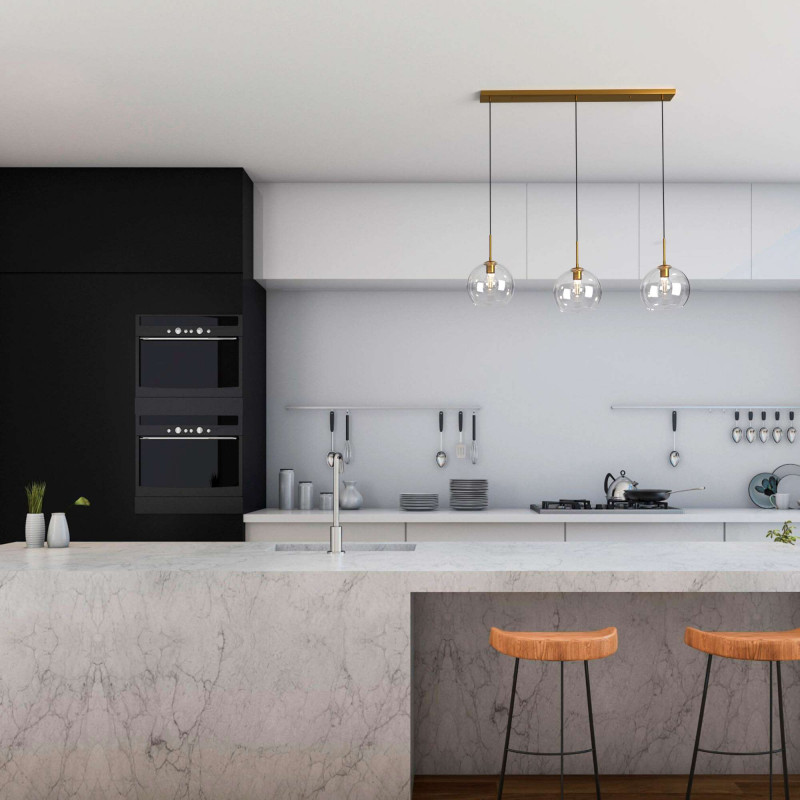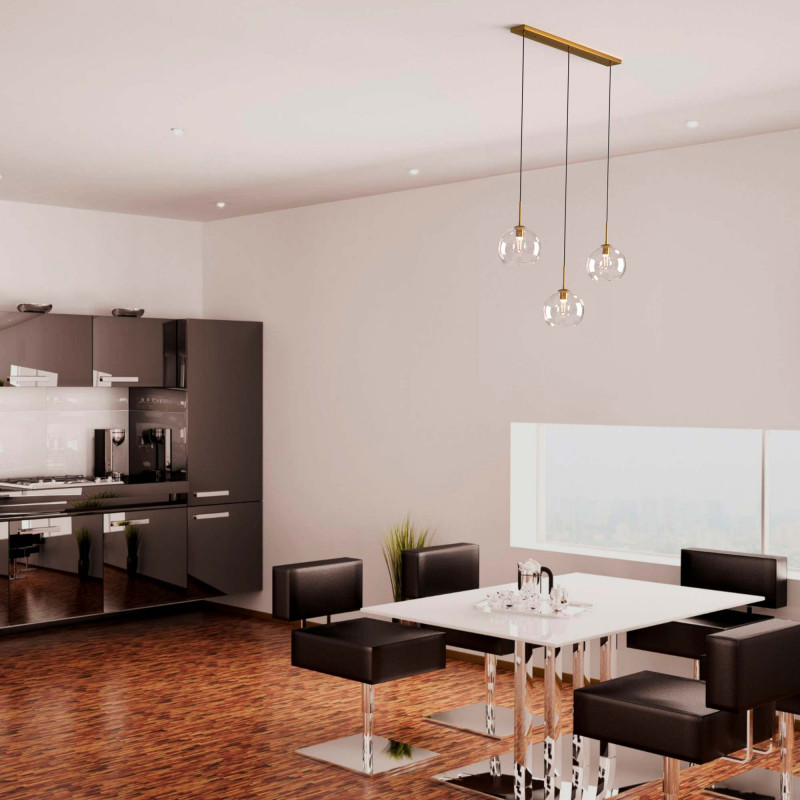 Το κρεμαστό φωτιστικό "Merce" διαθέτει τρία αμπαζούρ από διαφανές γυαλί υψηλής ποιότητας, επιτρέποντας στους λαμπτήρες να ξεχωρίζουν και παρέχοντας άμεσο φωτισμό.
