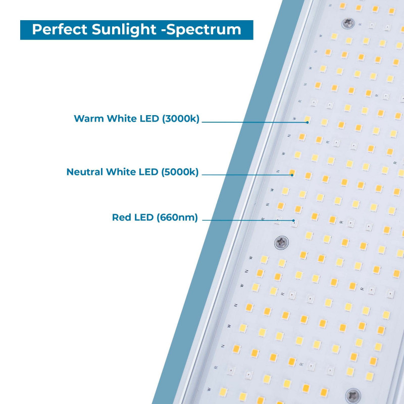 Όσον αφορά τη δομή του, αποτελείται από δύο μονάδες με τα LED κατανεμημένα ώστε να επιτυγχάνεται ομοιογενές φως σε όλο το επίπεδο, ελαχιστοποιώντας τις διαφορές στην ανάπτυξη των φυτών ανάλογα με τη θέση τους.