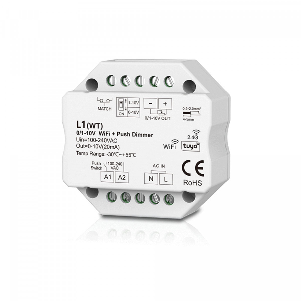 Αυτός ο ελεγκτής προσφέρει μια ολοκληρωμένη λύση για φωτιστικά σώματα LED με δυνατότητα ρύθμισης 0/1-10V, συνδυάζοντας σε μια συσκευή τον έλεγχο WiFi, RF 2,4GHz και Push-DIM.