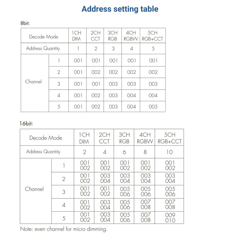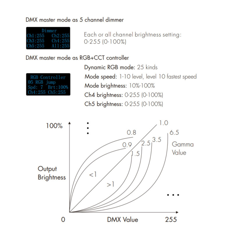 Προσφέρει λειτουργίες αποκωδικοποίησης 1 έως 5 καναλιών και διάφορες συχνότητες PWM. Επιτρέπει την επιλογή μεταξύ 8-bit ή 16-bit επιπέδων γκρι και τη ρύθμιση της καμπύλης εξασθένισης. Περιλαμβάνει αυτόνομες λειτουργίες ροής RGB και 5 καναλιών, καθώς και 25 ενσωματωμένα προγράμματα RGB.