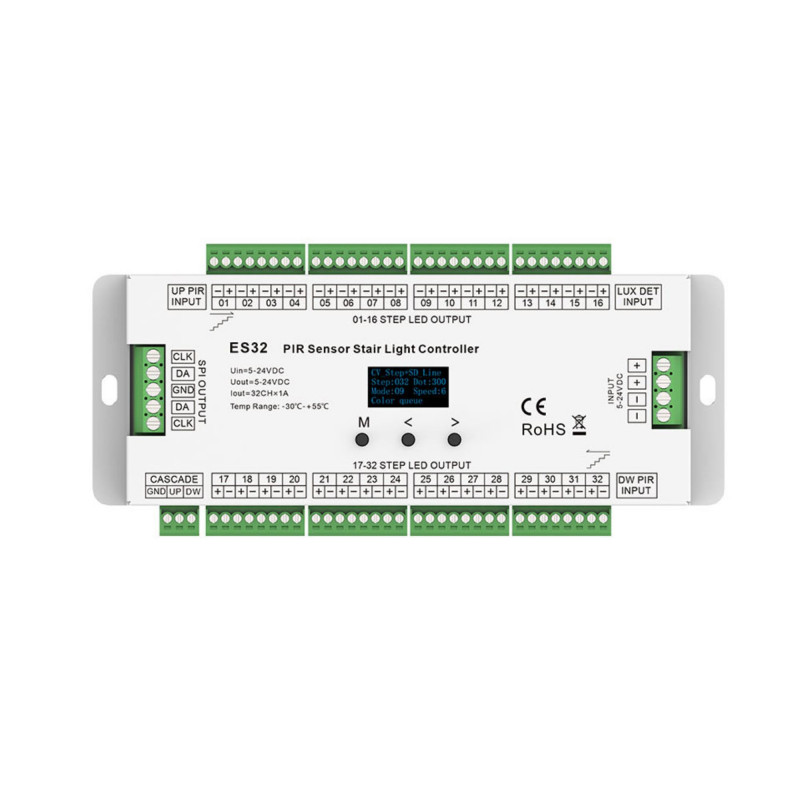 Για τον φωτισμό κλιμακοστασίων με περισσότερα από 32 σκαλοπάτια, μπορούν να τοποθετηθούν δύο ελεγκτές σε σειρά για συνεχή κάλυψη.