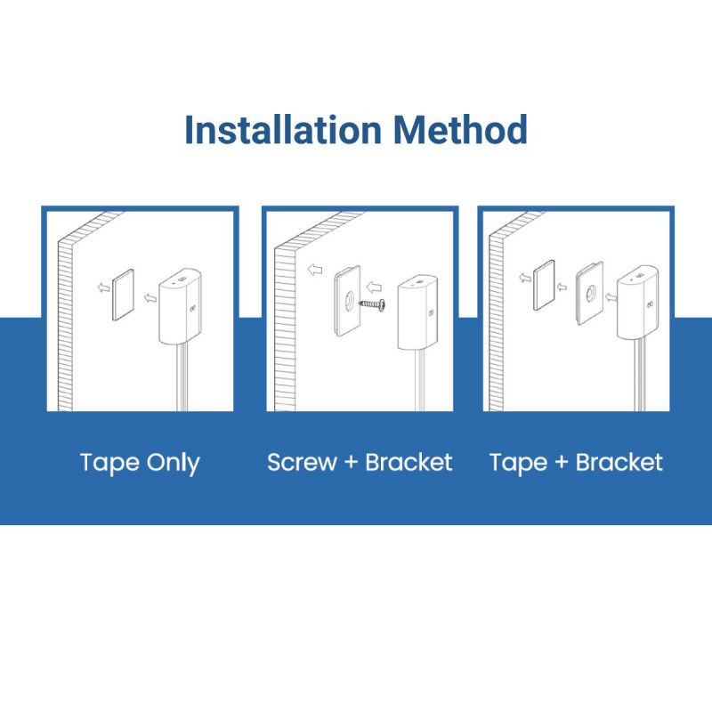 Ο αισθητήρας μπορεί να εγκατασταθεί με 3 διαφορετικούς τρόπους για να ταιριάζει σε διαφορετικές απαιτήσεις και περιβάλλοντα: Με αυτοκόλλητη ταινία, βιδωτή στερέωση ή με αυτοκόλλητη ταινία και συρόμενα στηρίγματα. Παρέχοντας έτσι επιλογές για την κάλυψη ποικίλων αναγκών εγκατάστασης.
