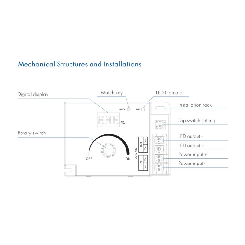 Με τέσσερις επιλέξιμες συχνότητες PWM (500Hz, 2kHz, 8kHz ή 16kHz), αυτός ο ροοστάτης προσφέρει πρόσθετη ευελιξία για τη βελτιστοποίηση της απόδοσης του φωτισμού LED και την αποφυγή ενδεχόμενου τρεμοπαίγματος.