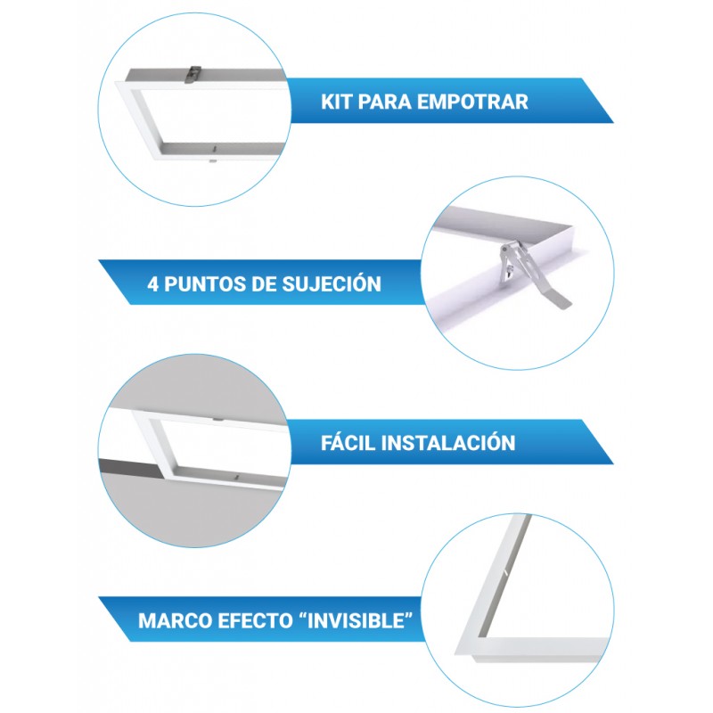 Το σετ αποτελείται από 4 κλιπ στερέωσης και αξεσουάρ που επιτρέπουν την εύκολη εγκατάσταση των χωνευτών πάνελ. Το κιτ εσοχής μετατρέπει τα πάνελ LED 120x60cm σε πάνελ εσοχής με πολύ απλό τρόπο. Η εγκατάσταση και η συναρμολόγηση είναι κατάλληλη για οποιονδήποτε, δεν απαιτείται επαγγελματίας.