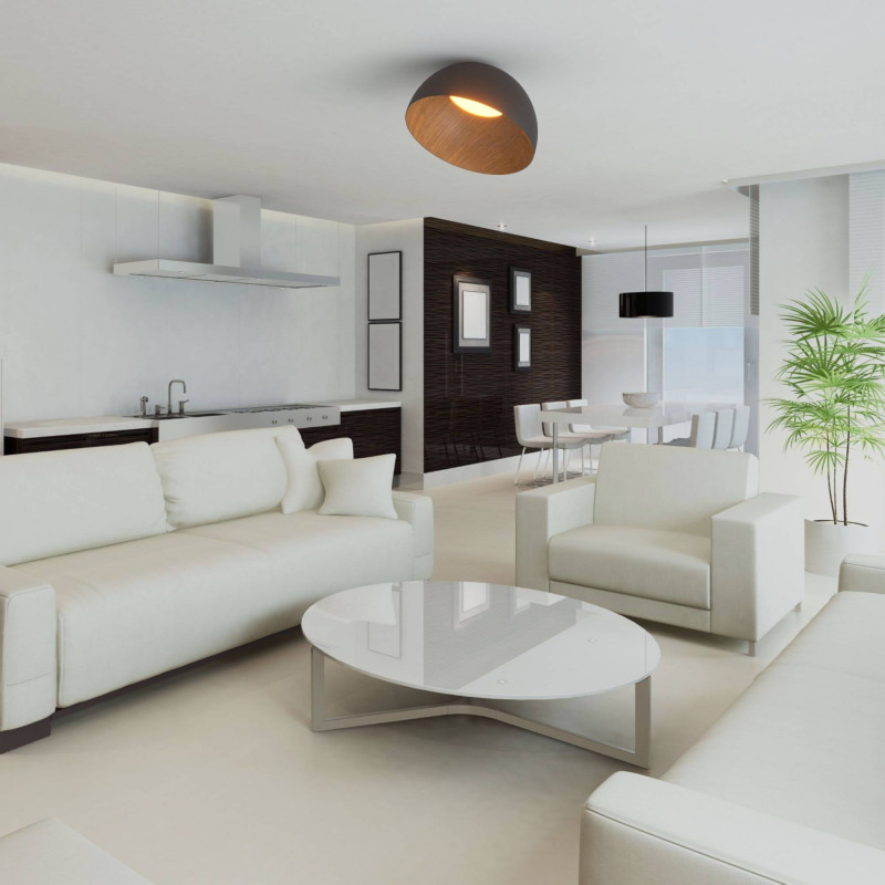 Μεταλλικό φωτιστικό οροφής LED διαθέσιμο σε λευκό ή μαύρο φινίρισμα με εσωτερικό σε χρώμα ξύλου και κεντρικό πολυκαρβονικό διαχύτη.