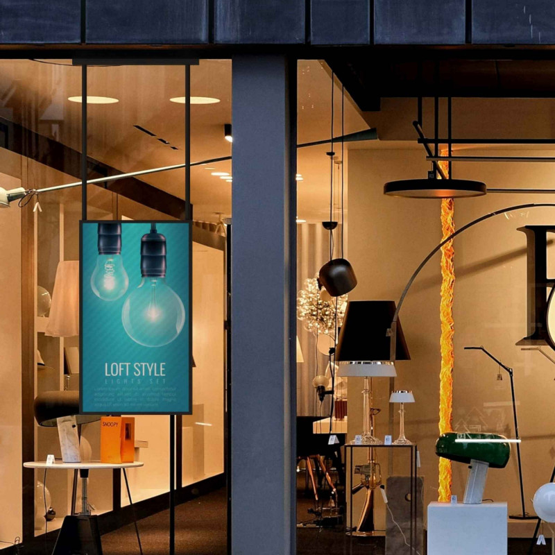 Αυτή η οθόνη είναι ειδικά σχεδιασμένη για βιτρίνες καταστημάτων με εγκατάσταση στην οροφή, επιτρέποντας έτσι στο να αξιοποιήσει στο έπακρο τον χώρο χωρίς εμπόδια ή κατασκευές στο δάπεδο. Επιτρέπει την προβολή διαφημιστικών βίντεο, εικόνων, ειδικών προσφορών ή ανακοινώσεων νέων προϊόντων, προσελκύοντας την προσοχή από μακριά. Ιδανικό για καταστήματα που αναζητούν ένα καθαρό, μοντέρνο και ιδιαίτερα αποτελεσματικό οπτικό αποτέλεσμα.