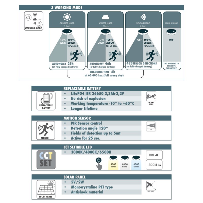 - Καλοκαιρινή λειτουργία: ηλιακό φωτιστικό ενεργοποιημένο στο 15%. Όταν ανιχνεύεται κίνηση, ενεργοποιείται στο 100%. Μετά από 25 δευτερόλεπτα επιστρέφει στον αρχικό του φωτισμό.