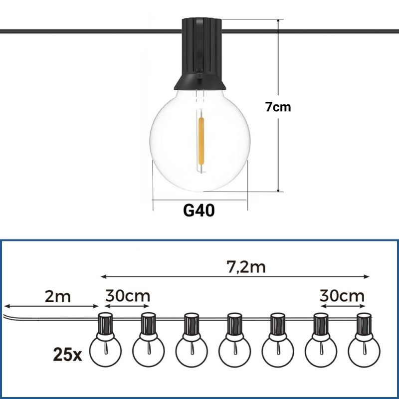 Está equipada con 25 bombillas de filamento E10 construidas en PVC, con una potencia de 1W cada una. Emiten una luz cálida (2700K), brindando un ambiente acogedor.
