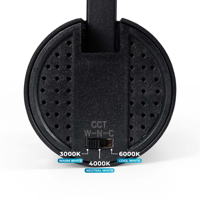 - CCT ajustable: luz cálida (3000K), neutra (4000K) o fría (6000K), configurable desde un Dip-switch posterior para adaptarse a distintos ambientes.