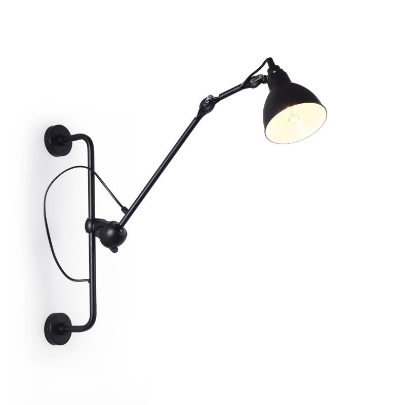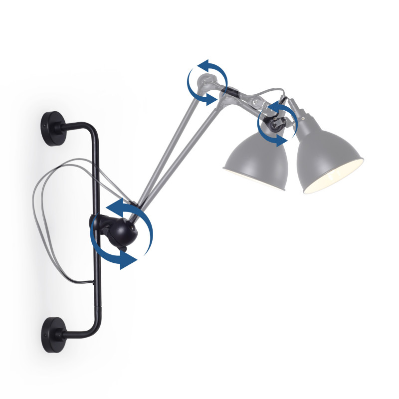- Formato articolato: ha una struttura fissa per il montaggio a parete e un braccio articolato con tre punti di regolazione che permettono di inclinare i pezzi e il paralume. La parte più lunga è girevole a 360°.