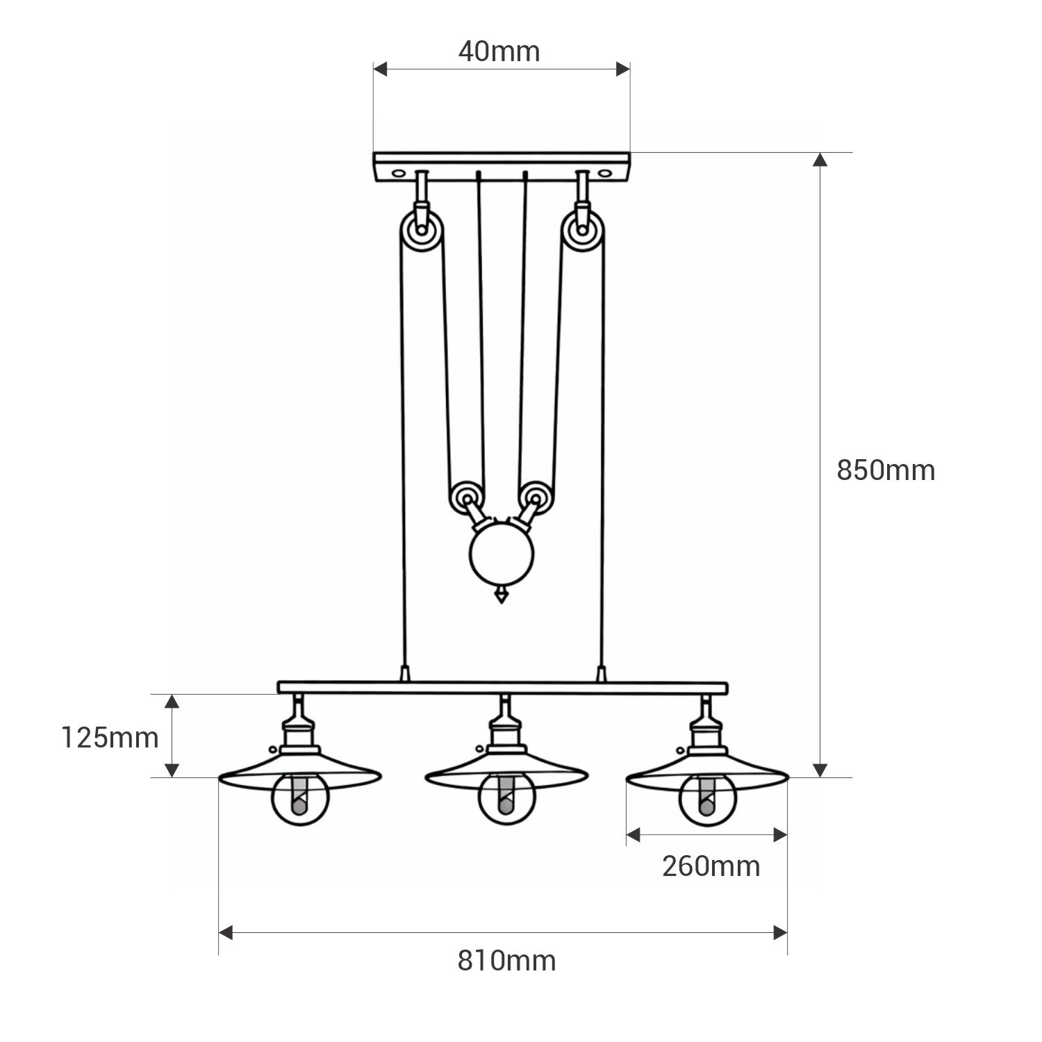 - Sistema di carrucole regolabili: consente una regolazione dell'altezza facile e senza sforzo. Include carrucole laterali, cavi retrattili ad alta resistenza e una puleggia centrale con contrappeso che mantiene la lampada stabile nella posizione desiderata.