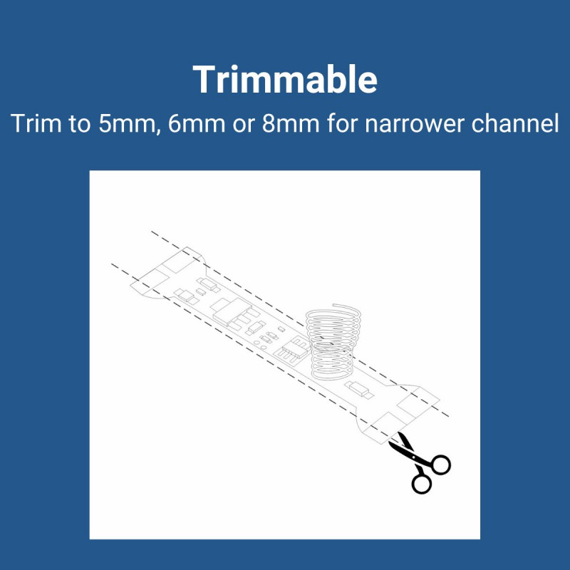 È realizzato in rame e montato su PCB di 10 mm di larghezza. È "trimmable", il che significa che può essere tagliato alle estremità per adattarsi a strisce LED di diverse larghezze: 5 mm, 6 mm, 8 mm e 10 mm.