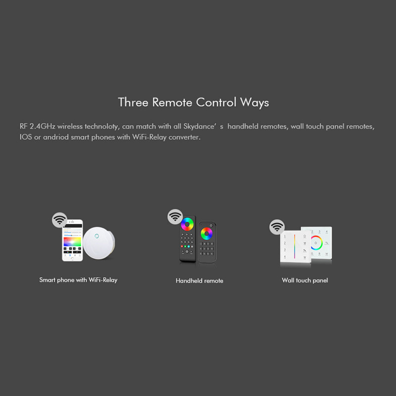 - Telecomando: compatibile con i telecomandi Skydance a radiofrequenza a 2,4 GHz monocolore, CCT, RGB/RGBW. Regolate l'illuminazione da qualsiasi luogo con telecomandi portatili, a parete o per smartphone (aggiungendo un gateway Wi-Fi).